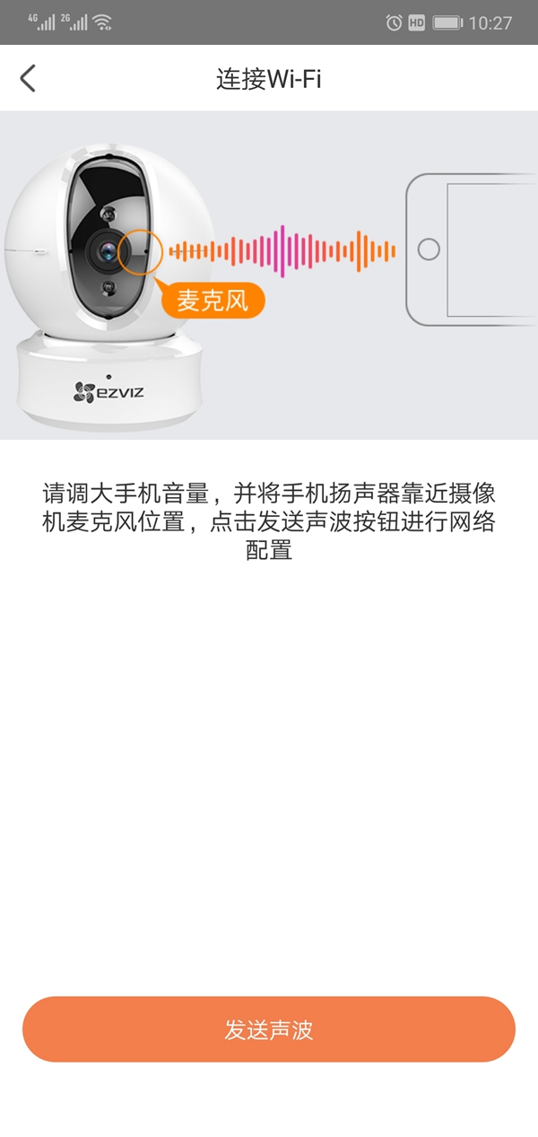 點(diǎn)擊“發(fā)送聲波”靠近攝像頭,設(shè)備會自動連接。如果有多個攝像頭,在攝像頭通電的狀態(tài)下,重復(fù)第三步。