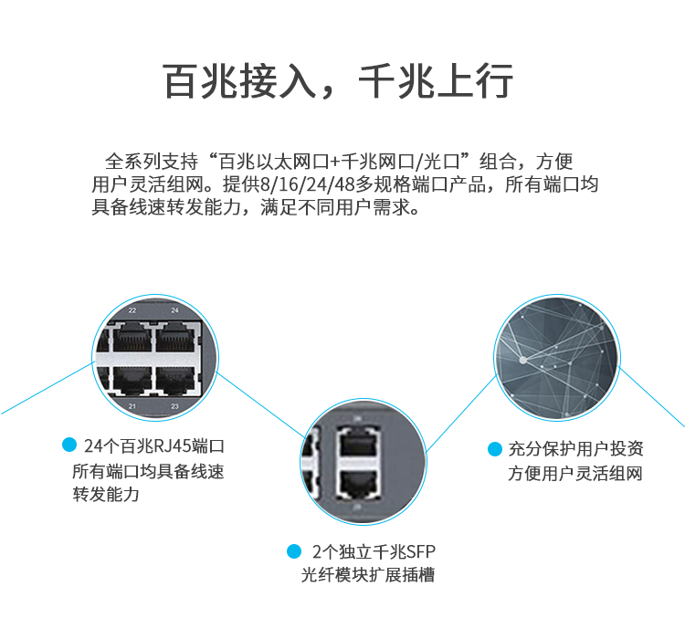 支持“百兆以太網(wǎng)口+千兆網(wǎng)口/光口”組合,方便用戶靈活組網(wǎng)。提供8/16/24/48多規(guī)格端口,所有端口均具備轉(zhuǎn)速能力,滿足不同用戶需求。